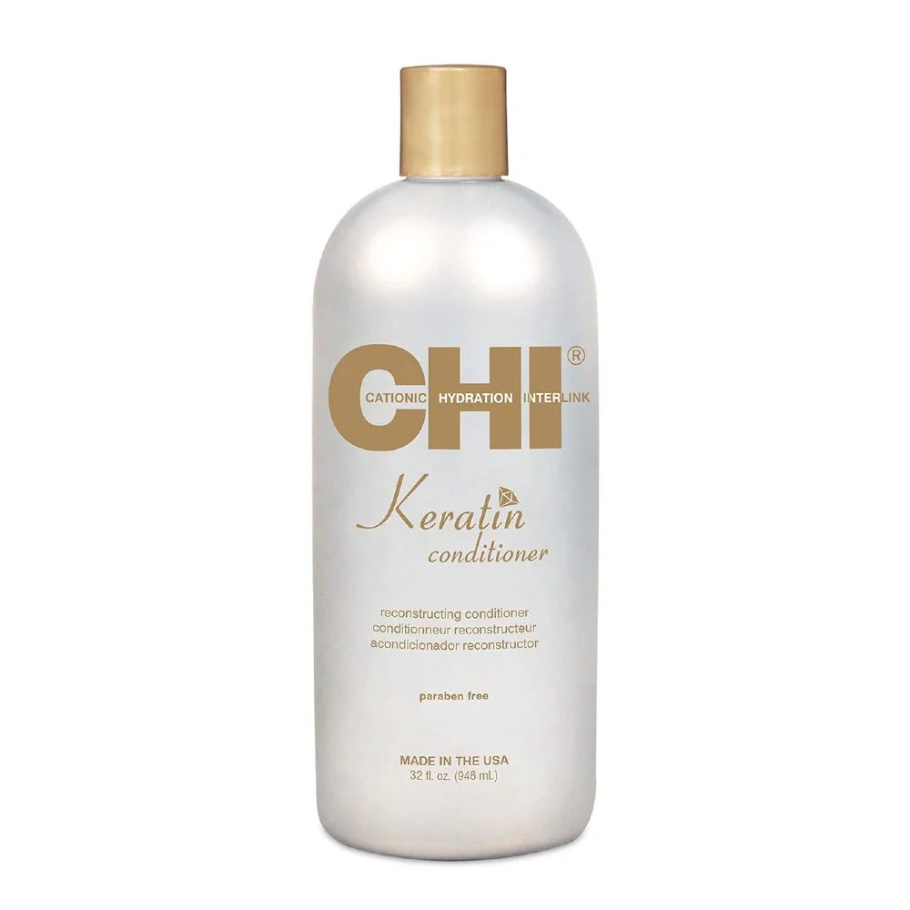 CHI Keratin Conditioner is een weldaad voor droog, beschadigd, pluizig of futloos haar. De conditioner herstelt de vochtbalans met de kracht van natuurlijke, essentiële oliën en keratine. CHI Keratin Conditioner bevat Keratix, wat het eigen keratine van het haar aanvult en het haar versterkt. Jojobaolie voedt het haar en de hoofdhuid, en houdt vocht vast. Arganolie hydrateert het haar en maakt het soepel. CHI Keratin Conditioner voorkomt het afbreken van het haar en maakt het makkelijker handelbaar. Deze conditioner is vrij van SLS, sulfaten en parabenen.