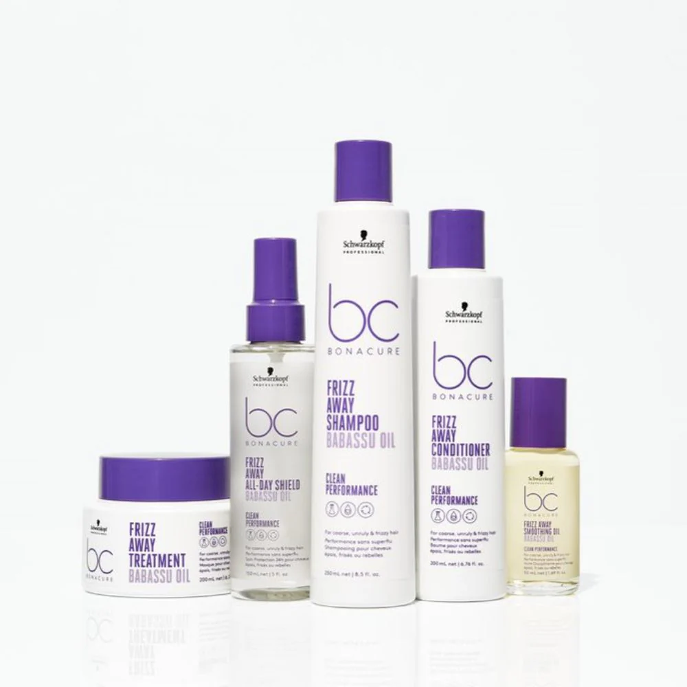 Schwarzkopf Professional Bonacure Frizz Away Conditioner is een conditioner tegen pluizig haar. Deze vegan conditioner is speciaal ontwikkeld om weerbarstig haar te ontklitten en pluisvrij te maken. Het haaroppervlak wordt geëgaliseerd en verzacht waardoor pluis tot 72 uur effectief wordt verminderd. De formule bevat babassu-olie om de elasticiteit en glans van het haar verbeteren. Babassu-olie is rijk aan antioxidanten en houdt vocht vast zodat het haar glad en pluisvrij wordt.